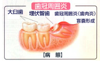 専門用語では歯冠周囲炎(しかんしゅういえん)智歯周囲炎(ちししゅういえん)と言いますが炎症が拡大すると喉の方や、アゴの下の方まで腫れあがり入院治療が必要となることもあります。